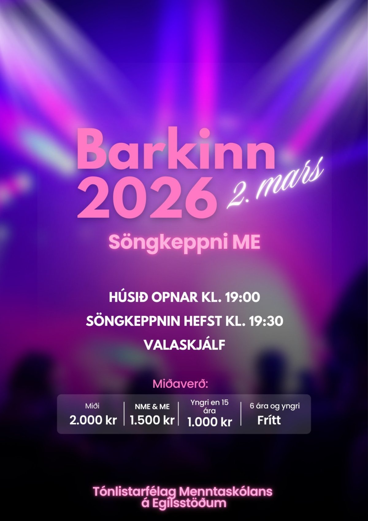 Barkinn, söngkeppni Menntaskólans á Egilsstöðum verður haldinn í Valaskjálf 2. mars næstkomandi. Húsið opnar kl. 19 og keppnin hefst klukkan 19:30.