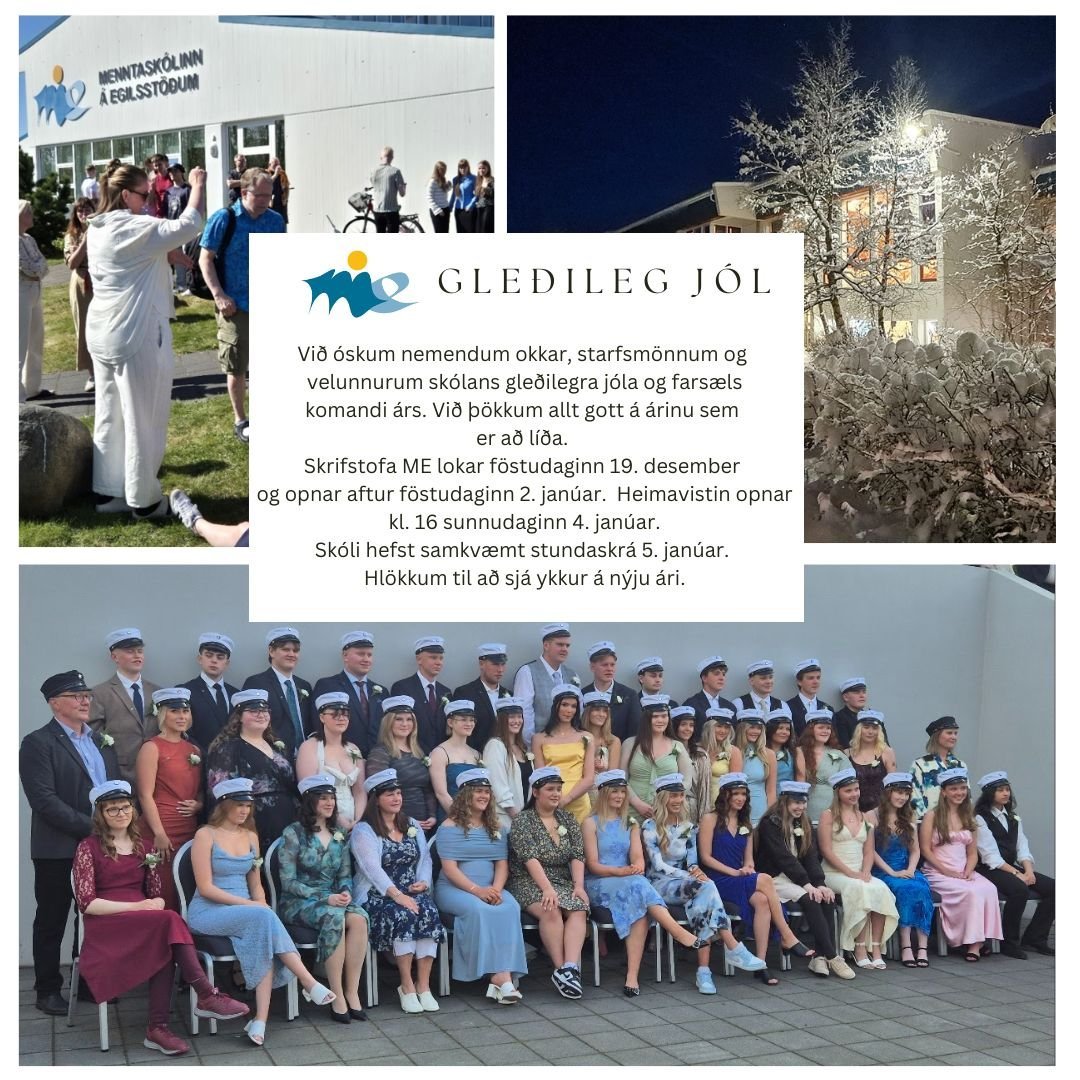 Skrifstofa ME lokar föstudaginn 19. desember og opnar aftur föstudaginn 2. janúar. Heimavistin opnar kl. 16 sunnudaginn 4. janúar. Skóli hefst samkvæmt stundaskrá 5. janúar. Hlökkum til að sjá ykkur á nýju ári.